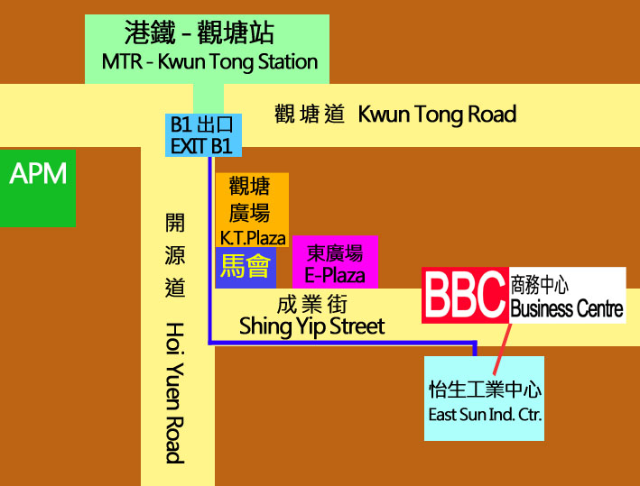本中心坐落觀塘黃金地段,鄰近觀塘地鐵站,由該站步行到本中心只需約五分鐘路程,附近交通網絡完善,而且各類大小公司林立,是經商的理想地方。